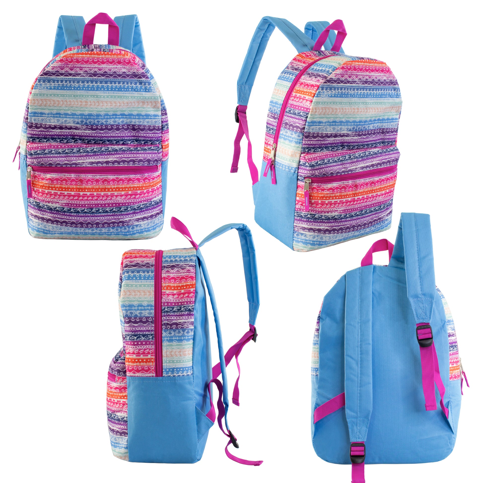 The 17 inch patterned wholesale backpacks are a good for all age students in elementary, middle or high school. Combine this book bag with your choice of bulk school supplies neatly packaged in individual kits. Perfect for back to school and as charity donation items.
